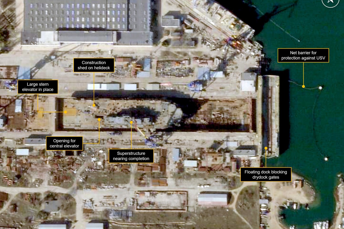 Pocas dudas desde el espacio. Las últimas imágenes satelitales muestran una realidad difícil de ignorar: Rusia está a punto de completar su mayor buque de guerra en el mar Negro. La superestructura está prácticamente finalizada, la cubierta de vuelo ya es plenamente identificable y los trabajos avanzan hacia su fase final con elementos clave casi listos.